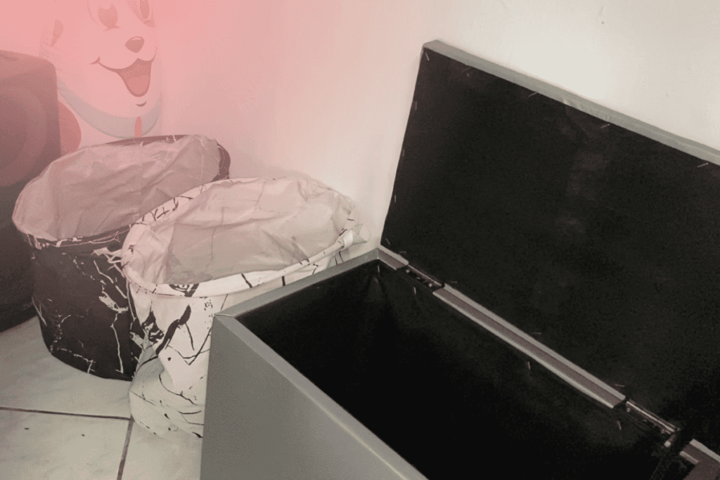 Eu adoro usar baús, eles são espaçosos, elegantes, você consegue combinar com sua decoração, e se os brinquedos estiverem amontoados lá dentro, ninguém está vendo.